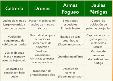 La cetrería, que utiliza aves rapaces entrenadas como halcones o azores, es una técnica efectiva y natural para el control de aves plaga (como palomas, gaviotas o estorninos) en aeropuertos, campos agrícolas, vertederos y zonas urbanas.